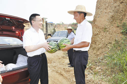 宜昌新洋丰党总支书记王德宜(左)为员工送上西瓜