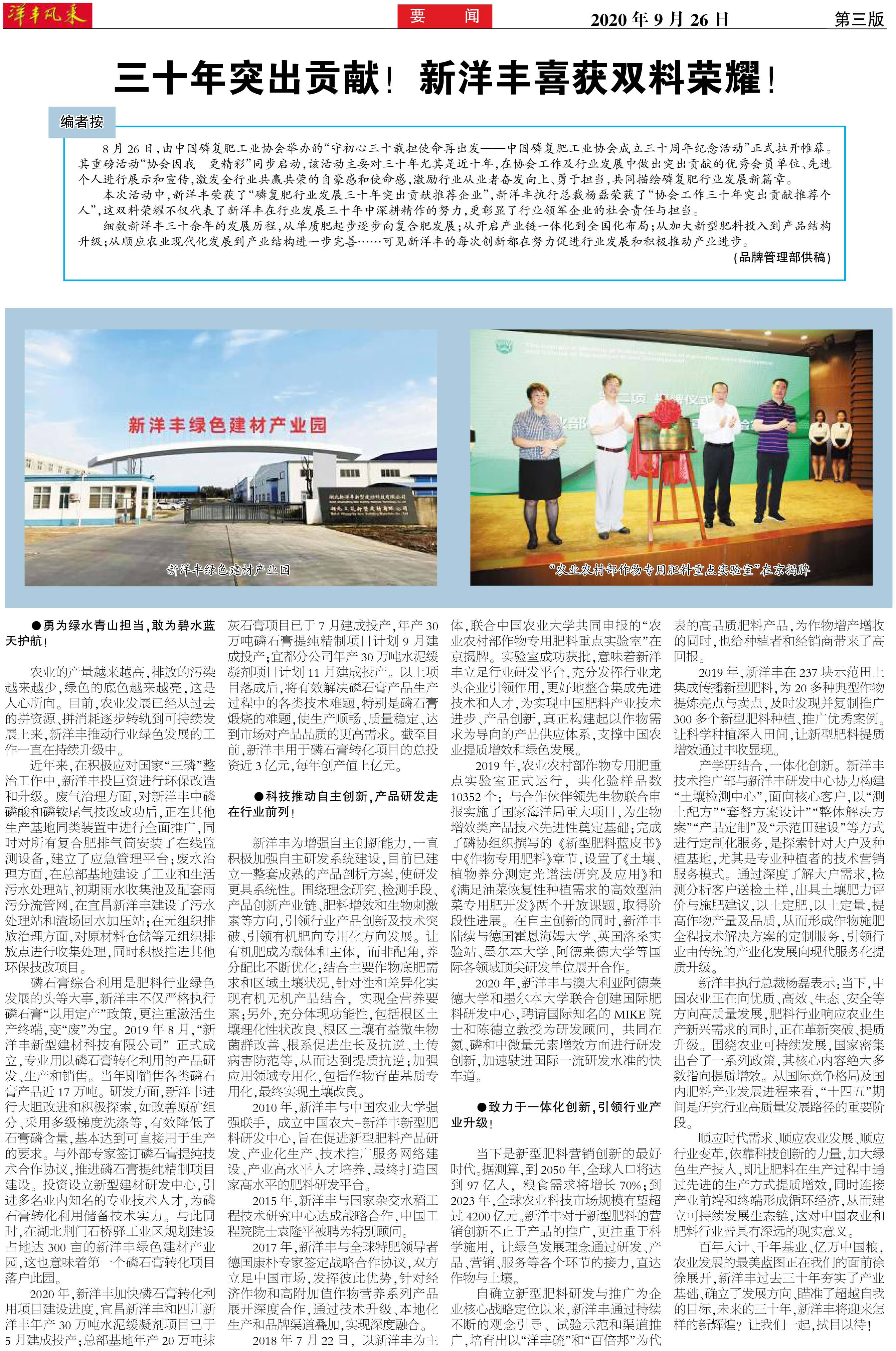 三十年突出贡献!新洋丰喜获双料荣耀!