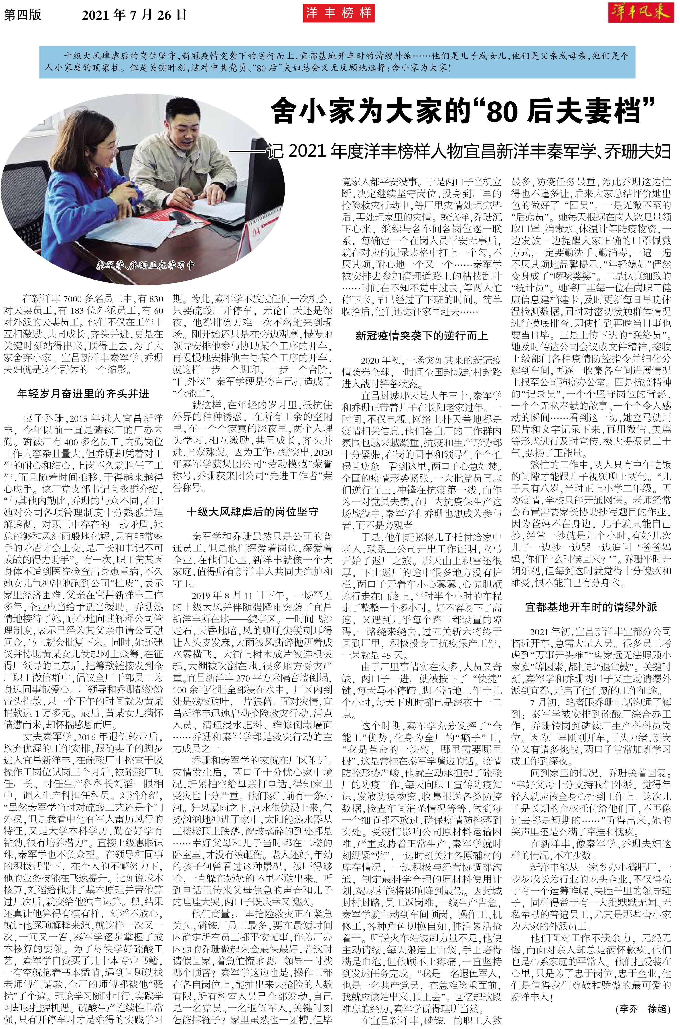 舍小家为大家的“80后夫妻档”——记2021年度洋丰榜样人物宜昌新洋丰秦军学、乔珊夫妇