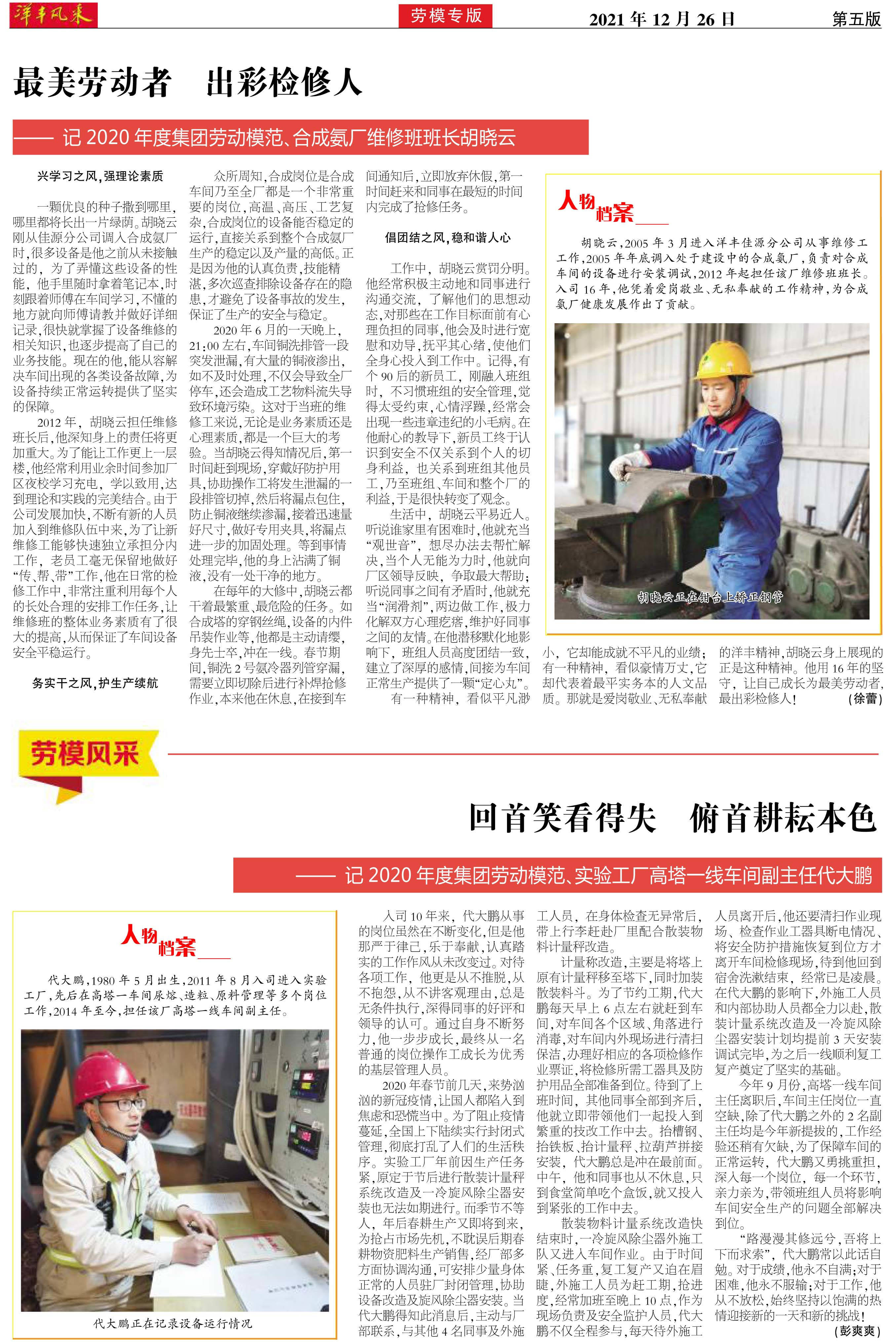 最美劳动者 出彩检修人——记2020年度集团劳动模范、合成氨厂维修班班长胡晓云