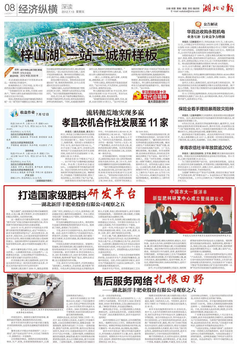 中国农大资源与环境学院院长、留德博士张福锁,曾任国务院测土配方施肥专家组组长,他专程来到新洋丰公司考察,荆门之行给他留下深刻印象:新洋丰拥有20多名专职农化人员、400多名销售人员、3000家代理商、30000个零售商,服务网络“根系”发达,肥料品质过硬,这正是要找的合作对象。