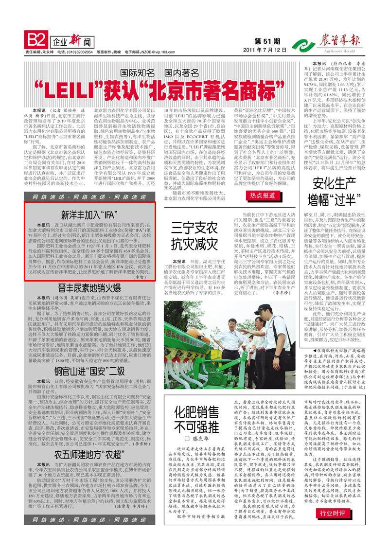 近日从湖北新洋丰肥业股份有限公司传来喜讯:在加拿大蒙特利尔市日前召开的国际肥料工业协会(简称“IFA”)第79届年会上,经过大会评议,新洋丰肥业被吸收为正式会员。这标志着该公司在走向国际舞台的征程上又迈出了可喜的一步。