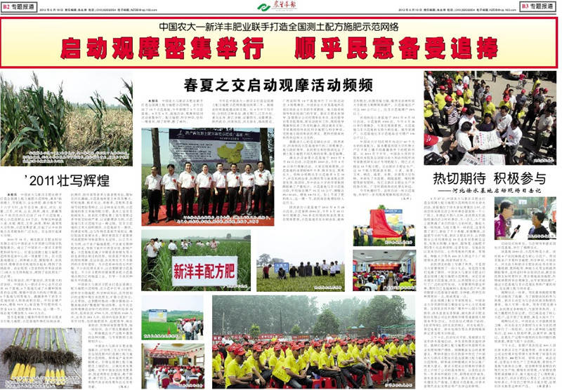 中国农大与新洋丰肥业联手打造全国测土配方施肥示范网络,去年启动了15个示范基地,今年新增了5个示范基地。4月至6月,基地启动、观摩和培训活动密集举行。 配方施肥,科学种田,恰似一缕春风,绿了原野,醉了神州。