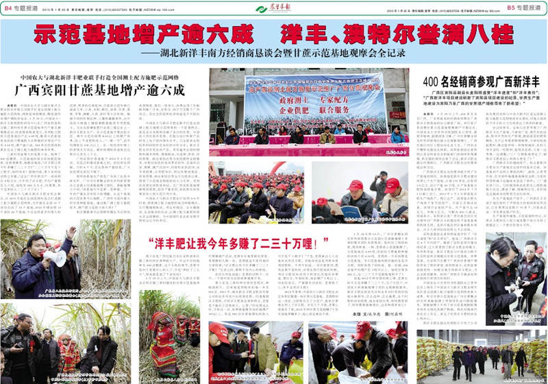 中国农业大学与湖北新洋丰肥业股份有限公司联手打造全国测土配方施肥示范网络,网络延伸到哪里,哪里就传来增产增收的佳音。19日,中国农大-新洋丰新型肥料研发中心在广西宾阳县和吉镇三黄村的甘蔗示范基地举行产量实测观摩活动,现场收获现场称重显示,采用配方肥的示范基地亩产达6.49吨,毗邻示范基地的农民按习惯施肥方式种植的甘蔗亩产只有4.14吨,增产逾6成,400多名经销商和蔗农见证了测土配方施肥的神奇效果。
