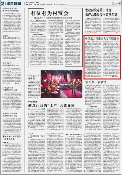 10月中旬,中国农业大学资源与环境学院再次推出油菜、蔬菜、苹果、大蒜等4大专用肥配方,并由湖北新洋丰肥业生产上市。这是继今年9月,中国农大资环学院设计6个小麦专用肥配方之后的又一重大突破。至此,中国农大资环学院已经成功设计出10个专用肥配方,完成了全国测土配方专用肥总体设计任务的1/3。