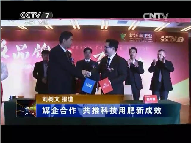 CCTV-7农业频道与湖北新洋丰肥业股份有限公司于2014年12月27日签署协议,结成2015年战略合作伙伴,双方将以服务三农为共同责任,积极探索新的媒企合作模式。据了解,新洋丰是一家磷复肥企业,多年来致力于建立全国测土配方施肥示范网络,推动科学用肥的种植模式,此次二者的结合,将为引导全国种植用肥取得更大成效。
