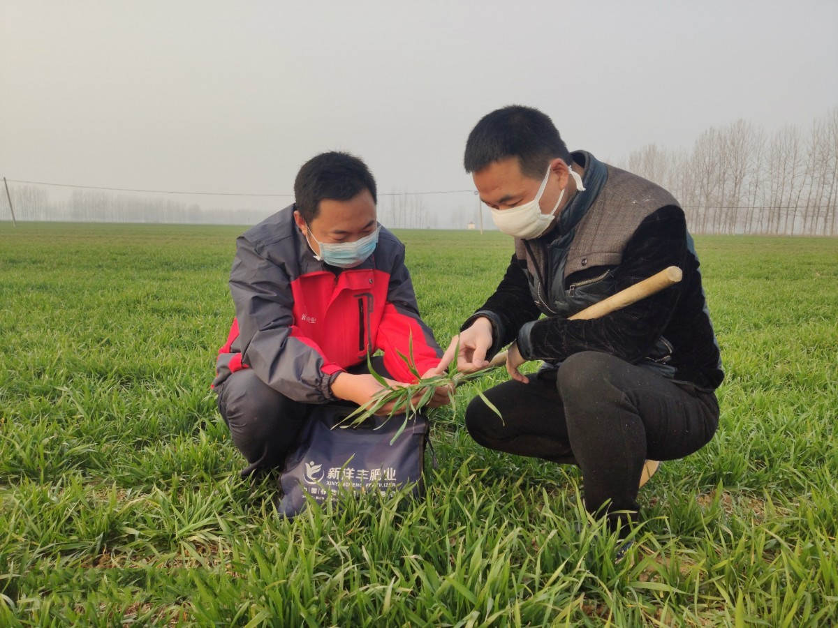 疫情期间,李飞(左)在遂平县做小麦春季技术指导