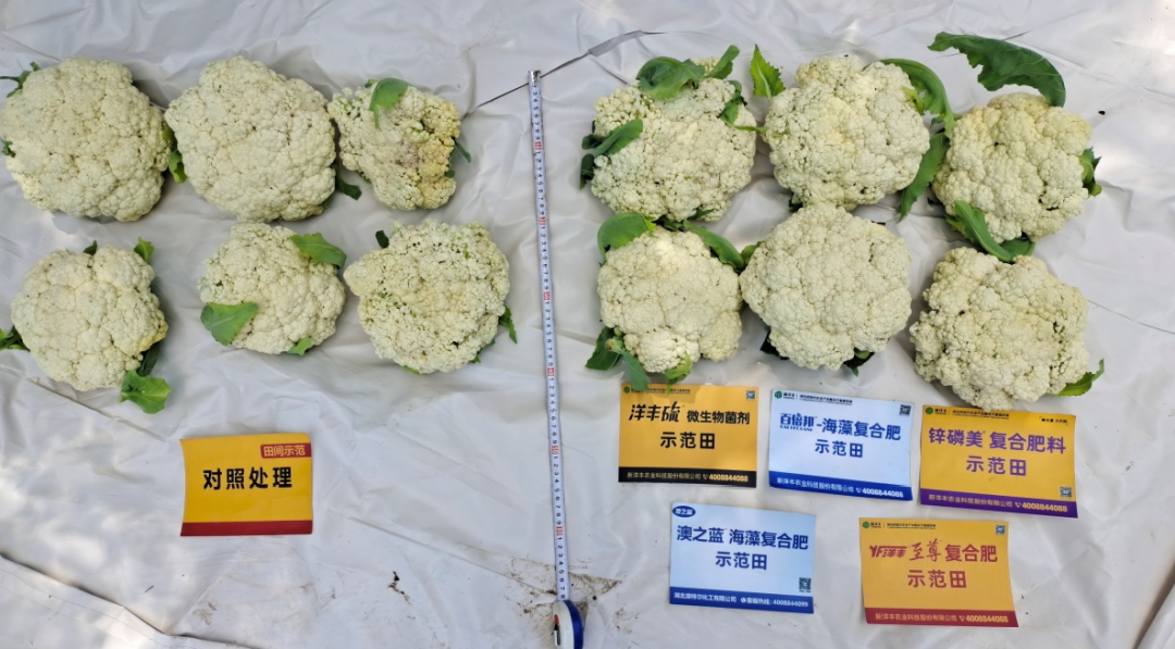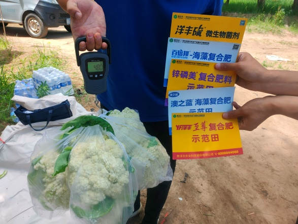 听了包建新的话,有些本来是站在田埂上观察白菜花长势的种植大户们更是走到菜地中间,仔细观察示范田与对照田白菜花的长势。他们对示范田白菜花叶片、茎秆及花球,齐齐竖起大拇指的同时,纷纷要求包建新和新洋丰农艺师为他们讲解白菜花的需肥规律及套餐肥功效,并解答他们在种植过程中遇到的疑难杂症。