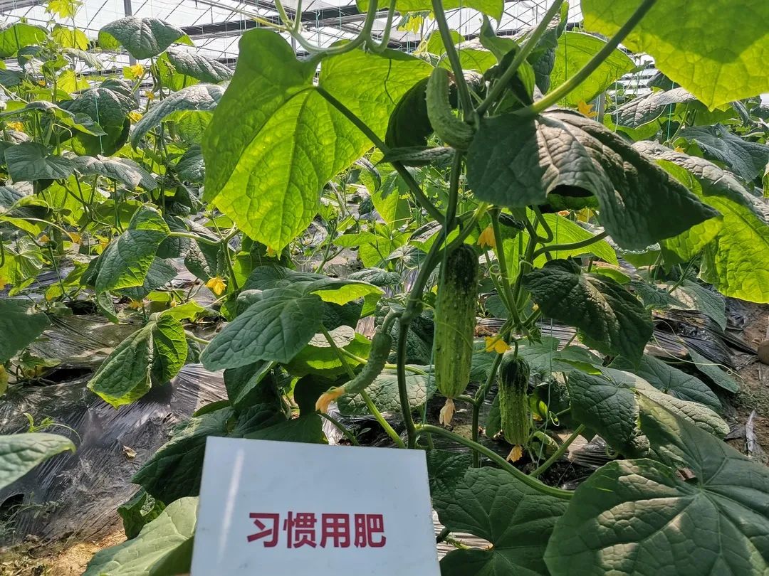 4月中旬回访时,正值黄瓜采收季,示范大棚黄瓜大小长势均匀,畸形瓜少,表现出更强的养分供应能力;反观对照,畸形瓜多,且存在化瓜现象。